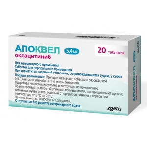 Апоквел 5,4 мг (20 таб) при дерматитах различной этиологии, сопровождающихся зудом, у собак.